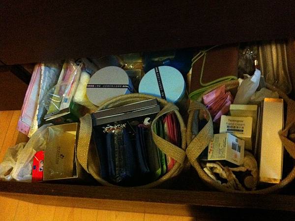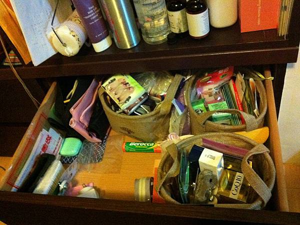 左上那一籃都是袖珍面紙,平時擺再好,抽屜開開關關也是會亂掉